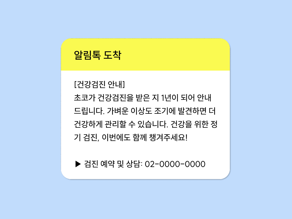 연 1회, 병원에 방문한 이력이 있는 보호자를 대상으로 건강검진을 안내하는 알림톡을 발송해 보세요. 반려동물에게 나타날 수 있는 여러 질환을 건강검진으로 예방할 수 있다는 점을 함께 안내할 수 있습니다.
