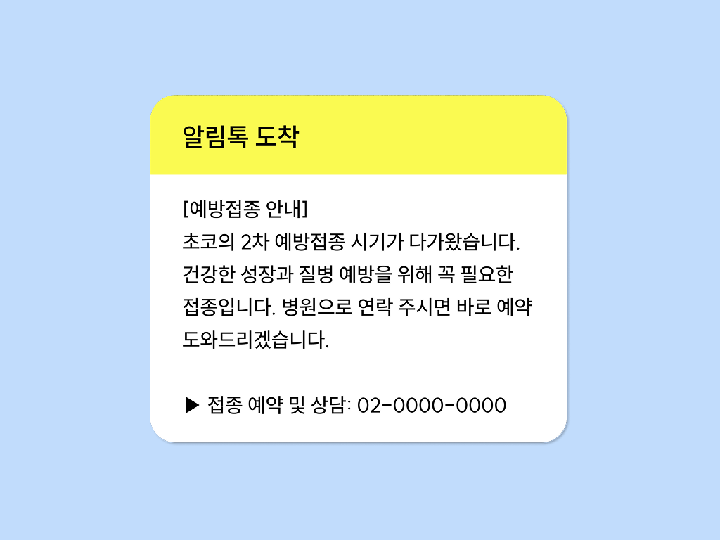 예방접종은 병원의 고정 환자를 늘리고, 자연스럽게 재방문을 유도할 수 있는 효과적인 수단 중 하나입니다. 알림톡 템플릿으로 보호자가 잊지 않고 방문할 수 있도록 안내해 보세요.