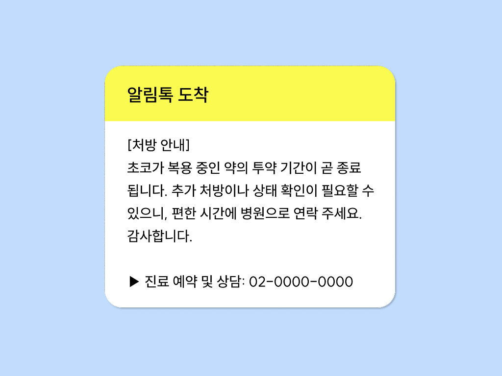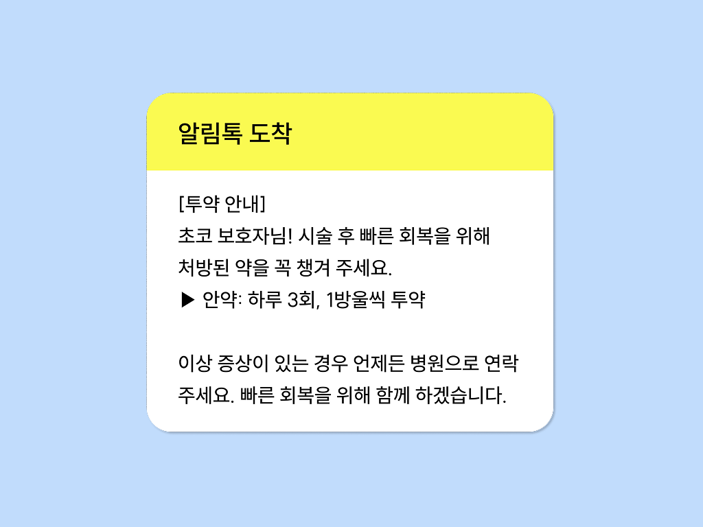 알림톡은 보호자가 예방접종, 건강검진 일정이나 추가 처방 등을 놓치지 않고 병원에 방문할 수 있도록 돕는 중요한 소통 수단입니다. 특히 반려동물 이름이 포함된 개인화 메시지는 보호자에게 좋은 인상을 남길 수 있습니다.