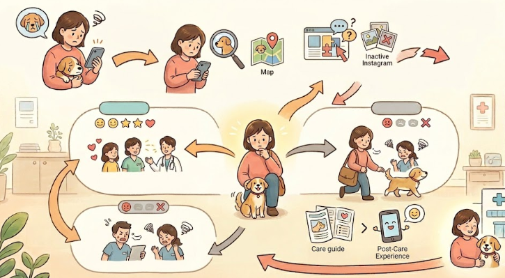 이건 숫자가 아니라 보호자의 마음과 행동의 흐름을 따라가는 방식입니다. "우리 아이가 갑자기 토하네, 어떡하지?" 하는 불안한 순간부터 시작해 동물병원을 검색하고, 문을 열고 들어와 진료를 받고, 집에 돌아가 다시 다음 예약을 잡기까지의 모든 과정을 하나의 지도로 그려보는 것이죠.
