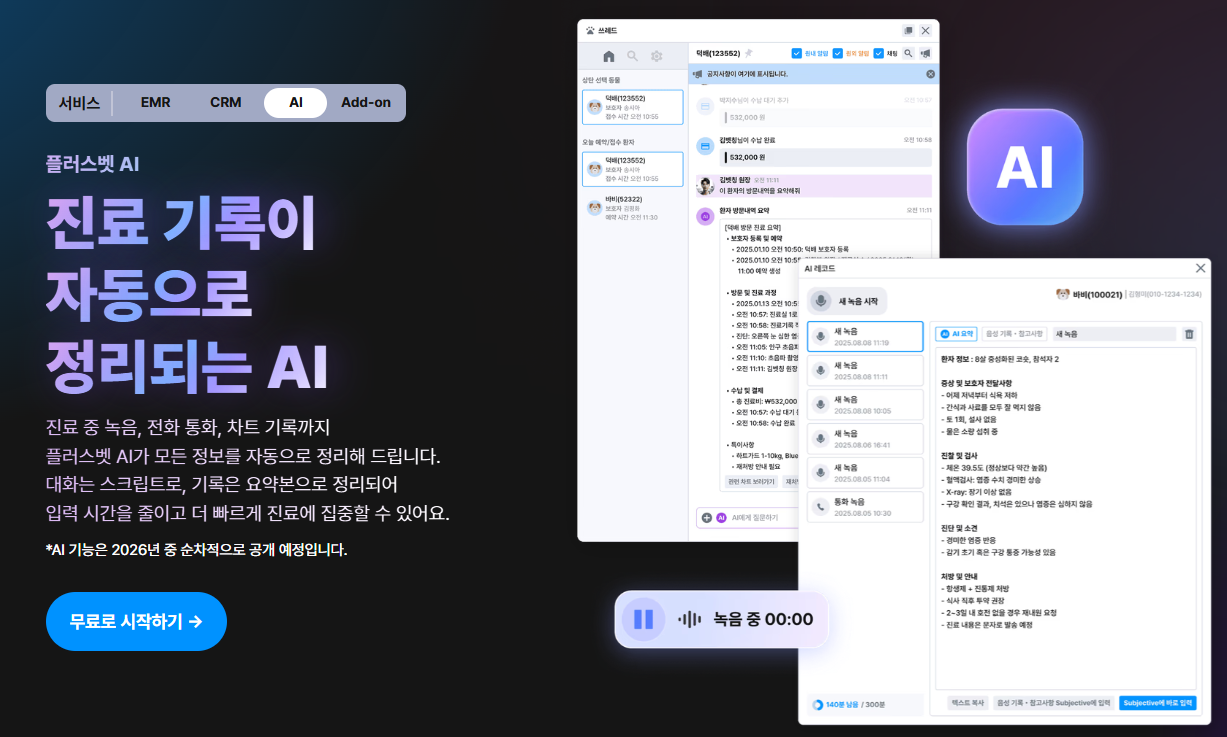 국내 동물병원 차트 시장을 보면, 주요 3사 -인투벳, 우리엔, 플러스벳- 모두 AI 기반 진료 요약, 전화 상담 자동 기록 기능을 준비하거나 실제로 제공하고 있어요. 진료 후 차트를 처음부터 타이핑하는 것과, AI가 1차로 정리해준 내용을 확인하고 수정하는 것은 업무량 자체가 다릅니다. 상담 내용이 차트에 제대로 안 남아서 다음 내원 때 다시 물어본 경험이 있으시다면, 이게 어떤 의미인지 바로 와닿으실 거예요.